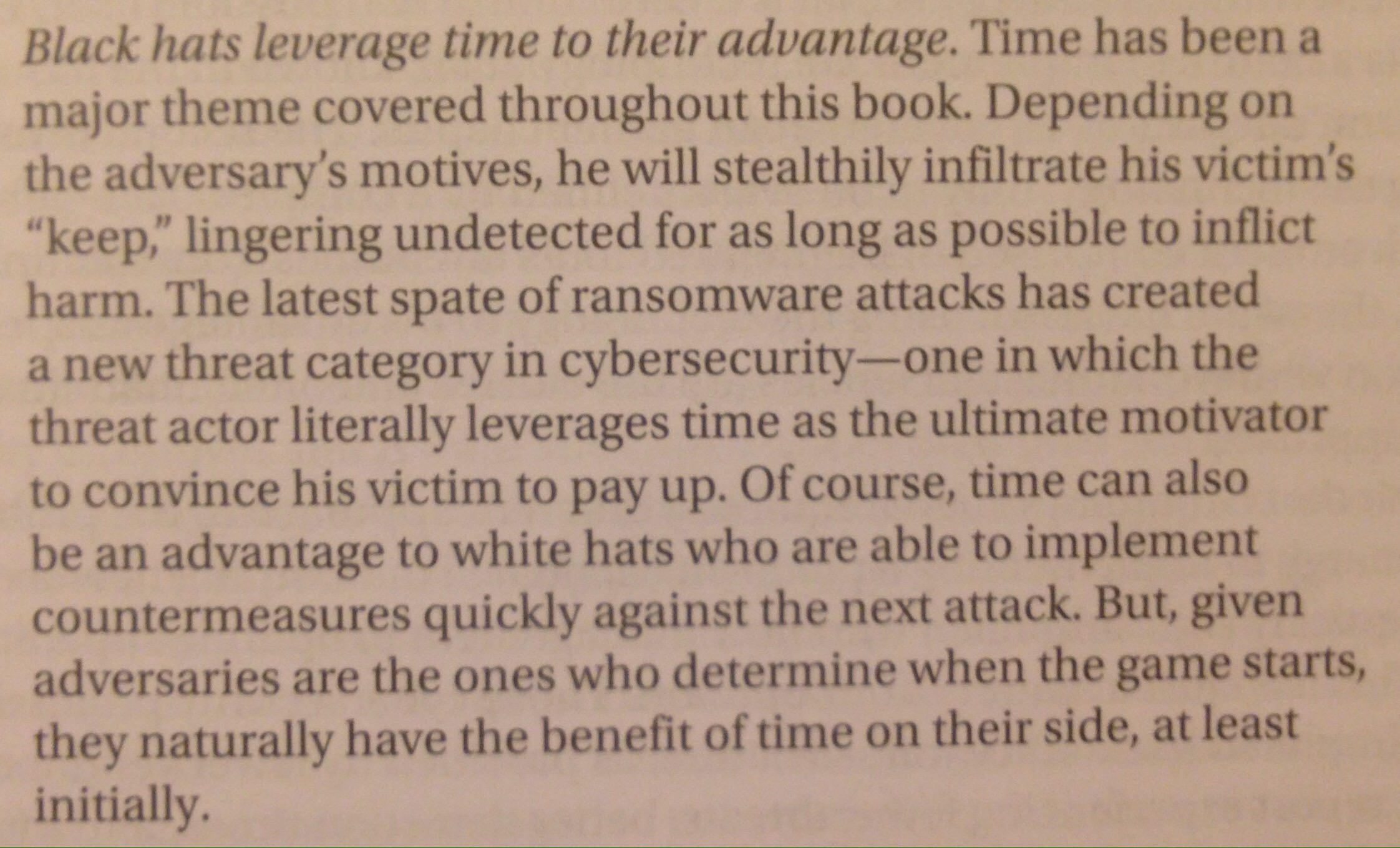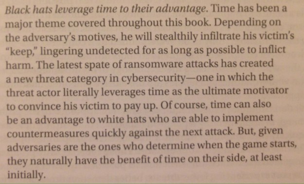 Chris Young at his keynote at Focus 2016 reflected on some trends over the last year. One of his observations, which is also expanded on in Mcafee’s book “The Second Economy,” is that threat actors or “black hats” use time against defenders (see below for excerpt from book).